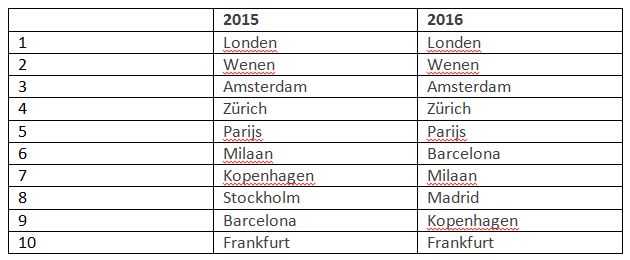 In vergelijking met 2015 is er weinig verandering in de ranglijst met Europa’s populairste zakenreisbestemmingen. De Europese steden die het vaakst worden bezocht, zijn nog steeds Londen, Wenen en Amsterdam. Door een 7,1% toename in geboekte tickets in 2016, stijgt Barcelona drie plaatsen, van 9 naar 6. Madrid, de tweede Spaanse stad op de ranglijst en nummer 8 in de top-10 van Europese steden, is met een 14,9% toename in geboekte tickets in 2016 de hoogstgeplaatste nieuwkomer. De hoge ranking van Madrid en Barcelona is te verklaren door de economische opleving in Spanje: de Spaanse economie zag vorig jaar een gemiddelde groei van 3,2%[1].