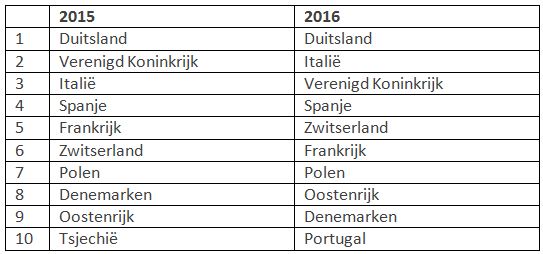 Duitsland blijft het meest populaire land voor zakenreizigers uit België. Italië stijgt met ongeveer 13% en vervangt het Verenigd Koninkrijk op de tweede plaats. Het Verenigd Koninkrijk en Spanje zijn derde en vierde, terwijl Frankrijk en Zwitserland de vijfde en de zesde plaats met elkaar wisselen. Oostenrijk en Denemarken ruilen de achtste en negende plaats. Polen blijft nummer zeven. “Opmerkelijk is de binnenkomt van Portugal op de tiende positie na een groei in één jaar tijd met 35%. Dat toont aan dat het land zich aan het herstellen is nadat het zo hard werd geraakt door de economische crisis”, zegt De Mol.