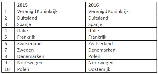 De zes meest populaire Europese landen blijven identiek: het Verenigd Koninkrijk, Duitsland, Spanje, Italië, Frankrijk en Zwitserland. Zweden, in 2015 nog op de zevende plaats, trekt minder Nederlandse zakenreizigers aan, waardoor het nu buiten de top tien valt. “Het bruto binnenlands product en importvolume van Zweden zijn in 2016 gedaald, waardoor ook het aantal geboekte vliegtickets naar Zweden met bijna 25% is gezakt”, verduidelijkt Diederik Banken, Vice President New Business & Client Retention EMEA. Denemarken (7) en Polen (8) groeien ten opzichte van 2015 met respectievelijk 14,7% en 21,5%. Oostenrijk (10) is een belangrijke nieuwkomer met een toename van het aantal geboekte vliegtickts van bijna 30%.